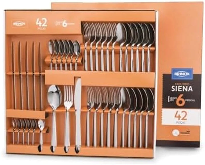 - FAQUEIRO COMPLETO PARA TODAS AS OCASIÕES O conjunto conta com 42 peças que atendem até 6 pessoas em todas as refeições. Inclui 06 colheres de mesa, 06 garfos de mesa, 06 facas de mesa, 06 colheres de sobremesa, 06 garfos de sobremesa, 06 colheres de chá e 06 colheres de café.