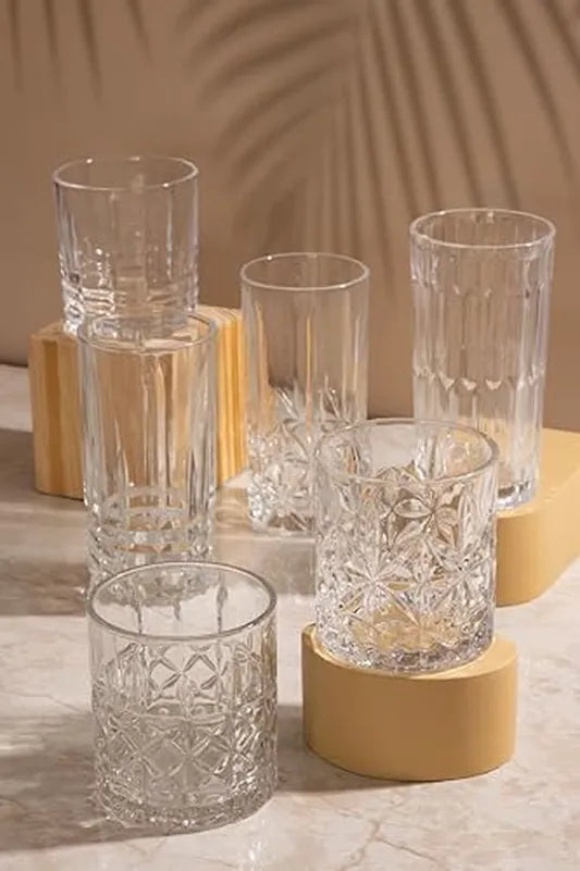 - Especificações: O conjunto é composto por 6 copos com capacidade individual de 350 ml, fabricados em vidro resistente. Cada copo mede 7 x 7 x 14 cm e pesa 427 g, combinando leveza com robustez e um acabamento texturizado para maior sofisticação.